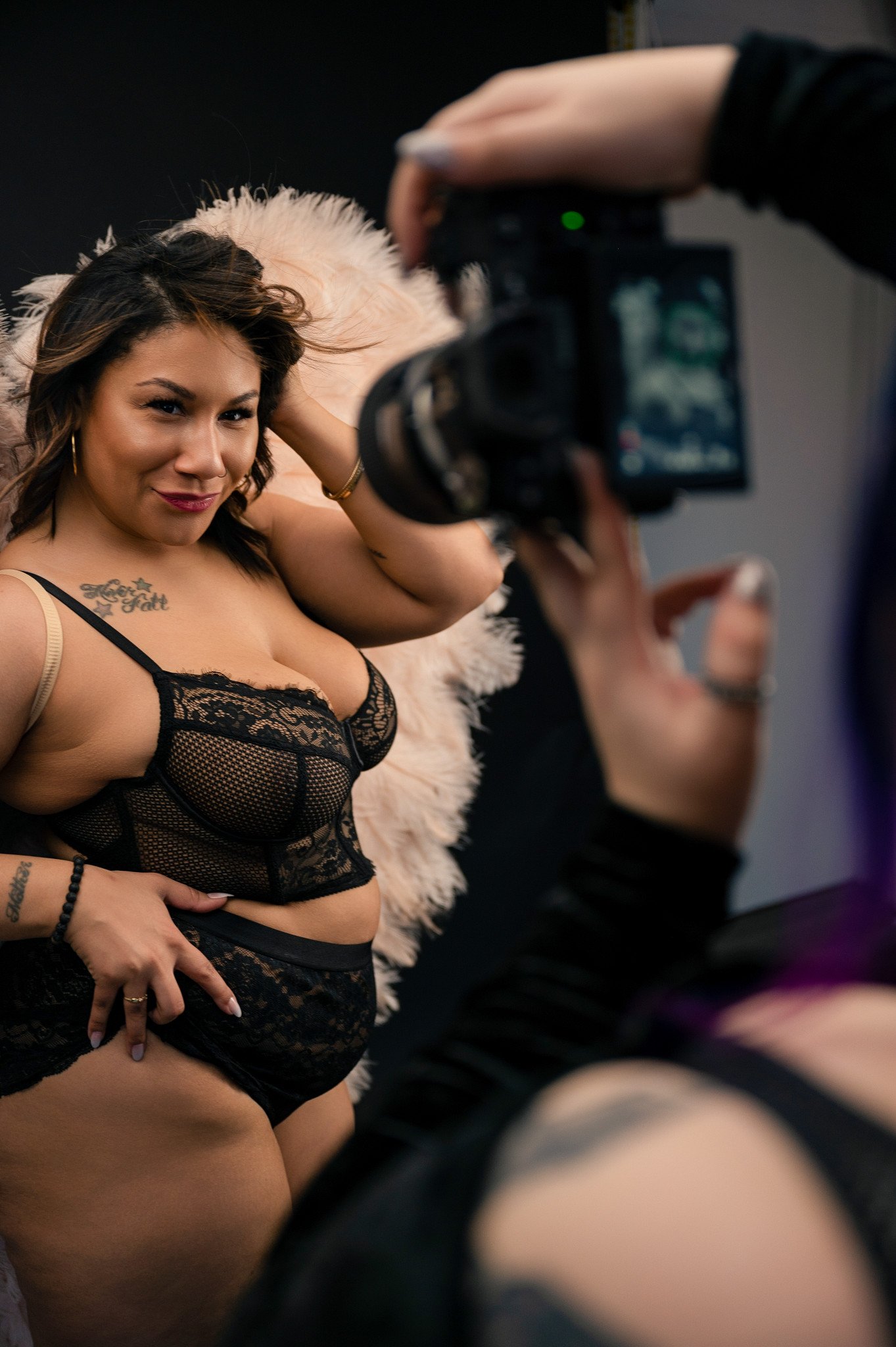 If there are areas you feel less confident about, wardrobe can also help soften attention with sleeves, layers, or texture. Lighting and posing will also support this.