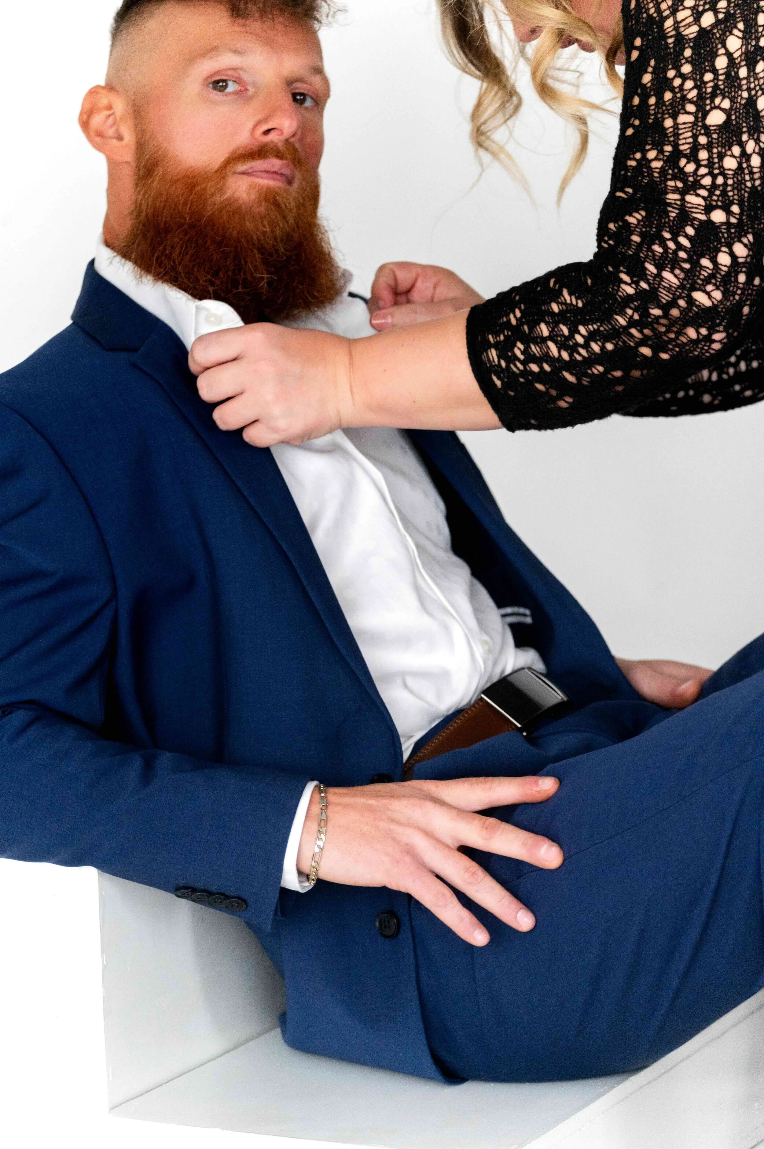 • A masculine partner in structured clothing or a suit